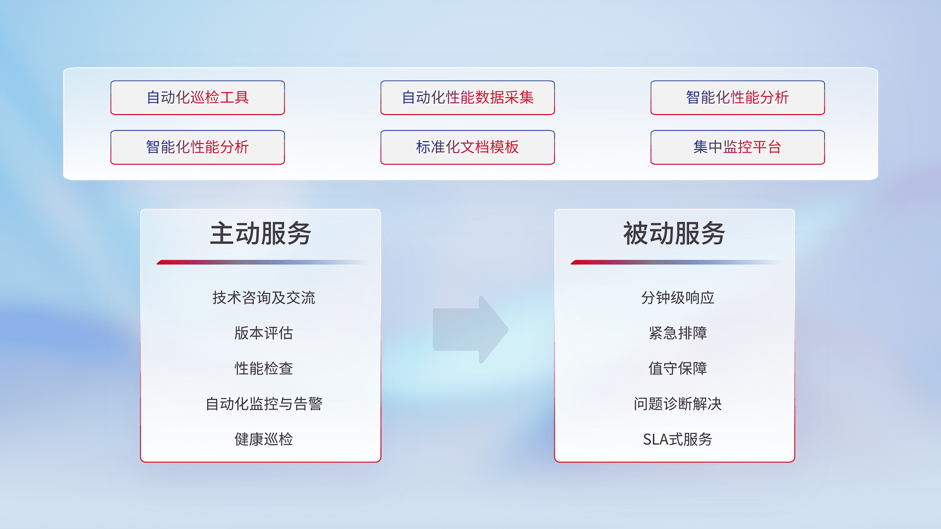 智能化工具和标准化文档,,保障服务质量,,,,提供主动服务(包含技术咨询、、、版本评估、、、、性能检查、、、自动化监控与告警、、、、健康巡检)和被动服务包含(分钟级响应、、、紧急排障、、、值守保障、、、、问题诊断解决、、、、SLA服务)。。